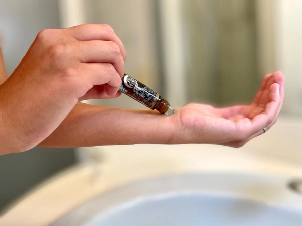 To use it, just roll some of the fragrant oil on your pulse points, like wrists, neck, and temples, and massage gently. Apply beneath the nostrils when you have a cold.