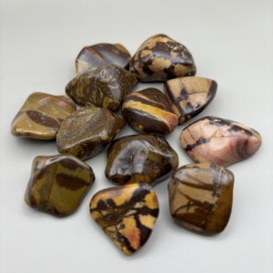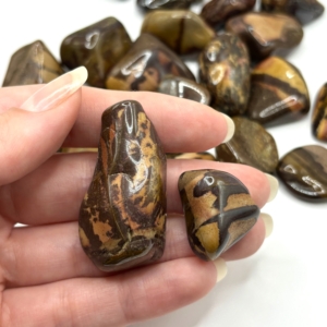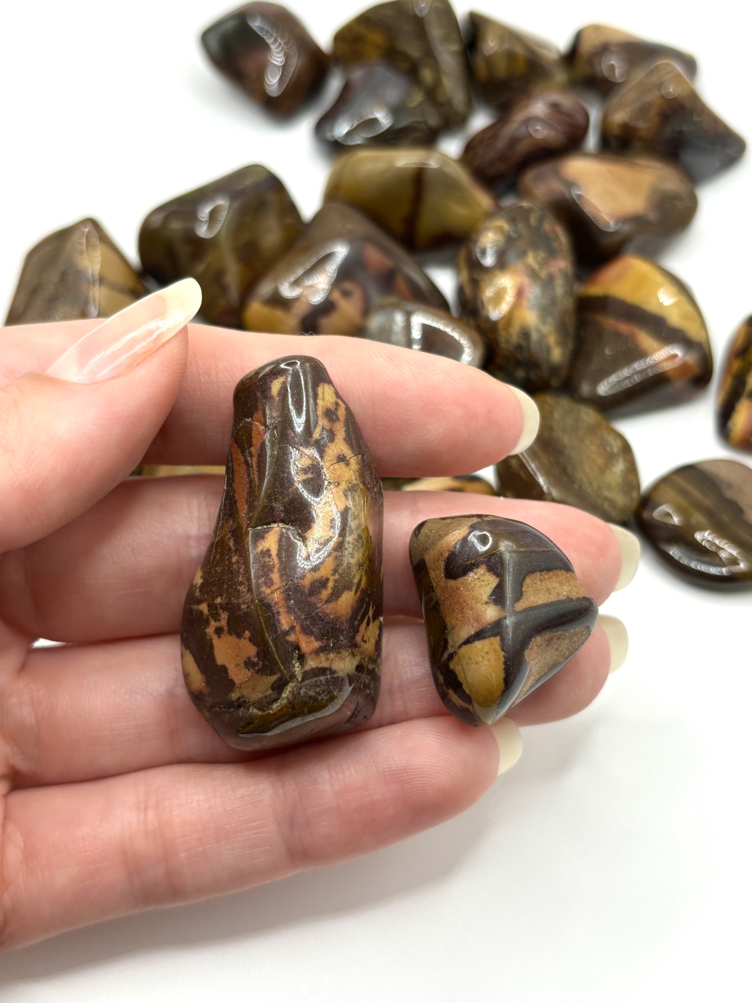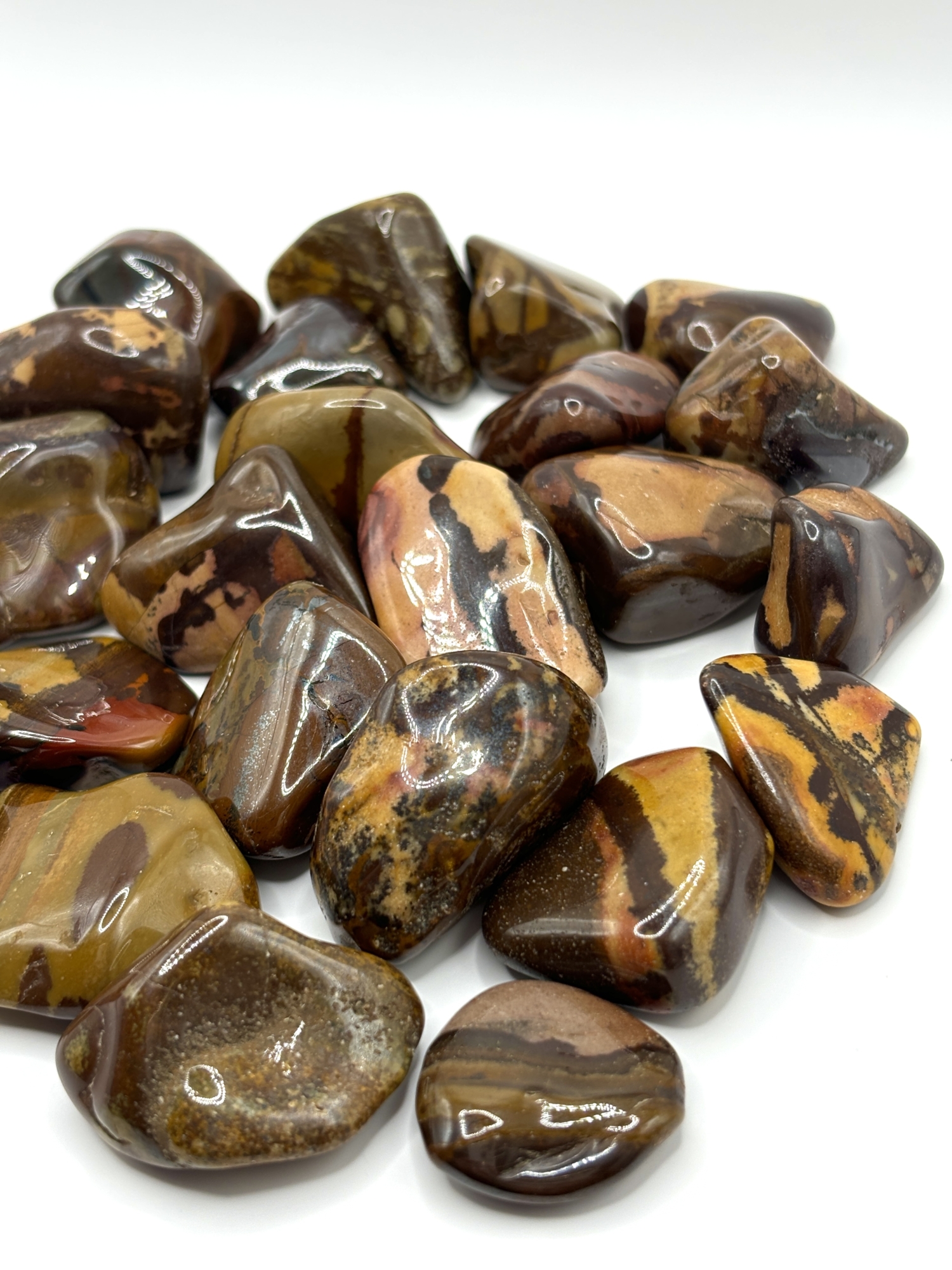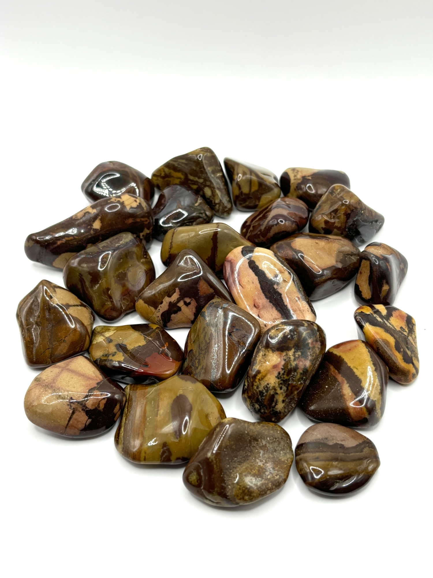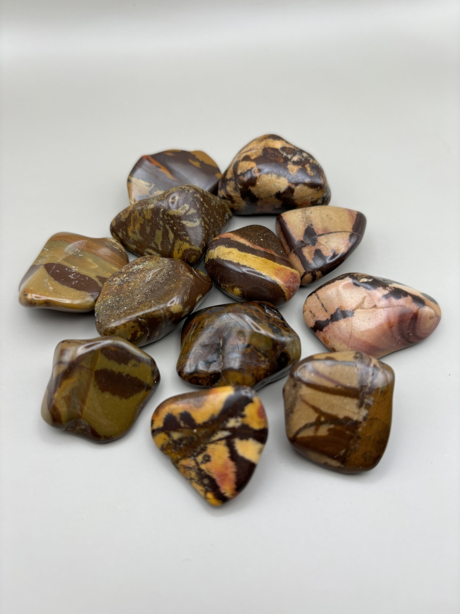 Jasper Nguni African Tumble Stones are known for their unique, scenic patterns reminiscent of landscapes. These stones are cherished for their grounding and creative energies, making them perfect for anyone seeking inspiration and connection with nature.