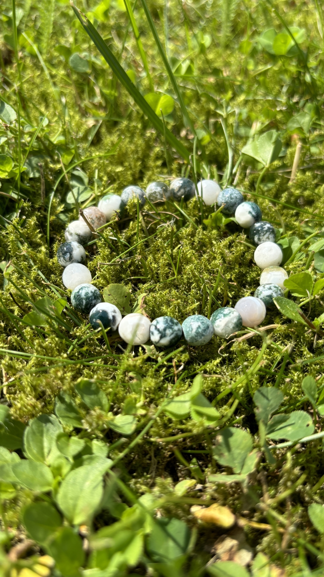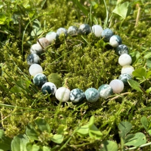 A Tree Agate stone bracelet radiates serenity and connection to nature, featuring earthy tones of green and white reminiscent of forest landscapes. Known as the “Stone of Inner Peace,” Tree Agate is highly regarded for its grounding and stabilizing energy.